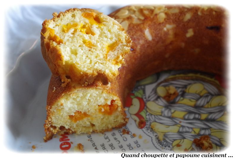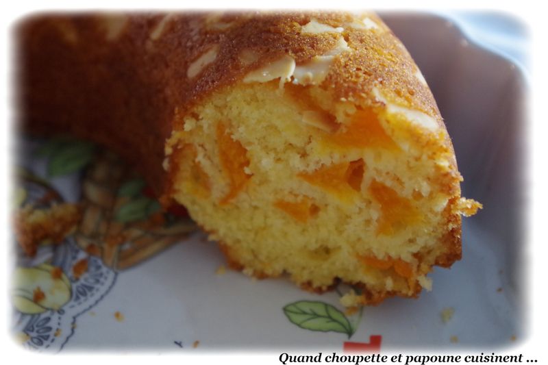 Dans le bol de votre robot , mettre tous les ingrédients bien mélanger , ajouter les abricots coupés en morceaux , mélanger , beurrer un moule a manqué de 220 ou moule a savarin , ajouter des amandes effilées dans tout le fond du moule et verser la préparation dedans.